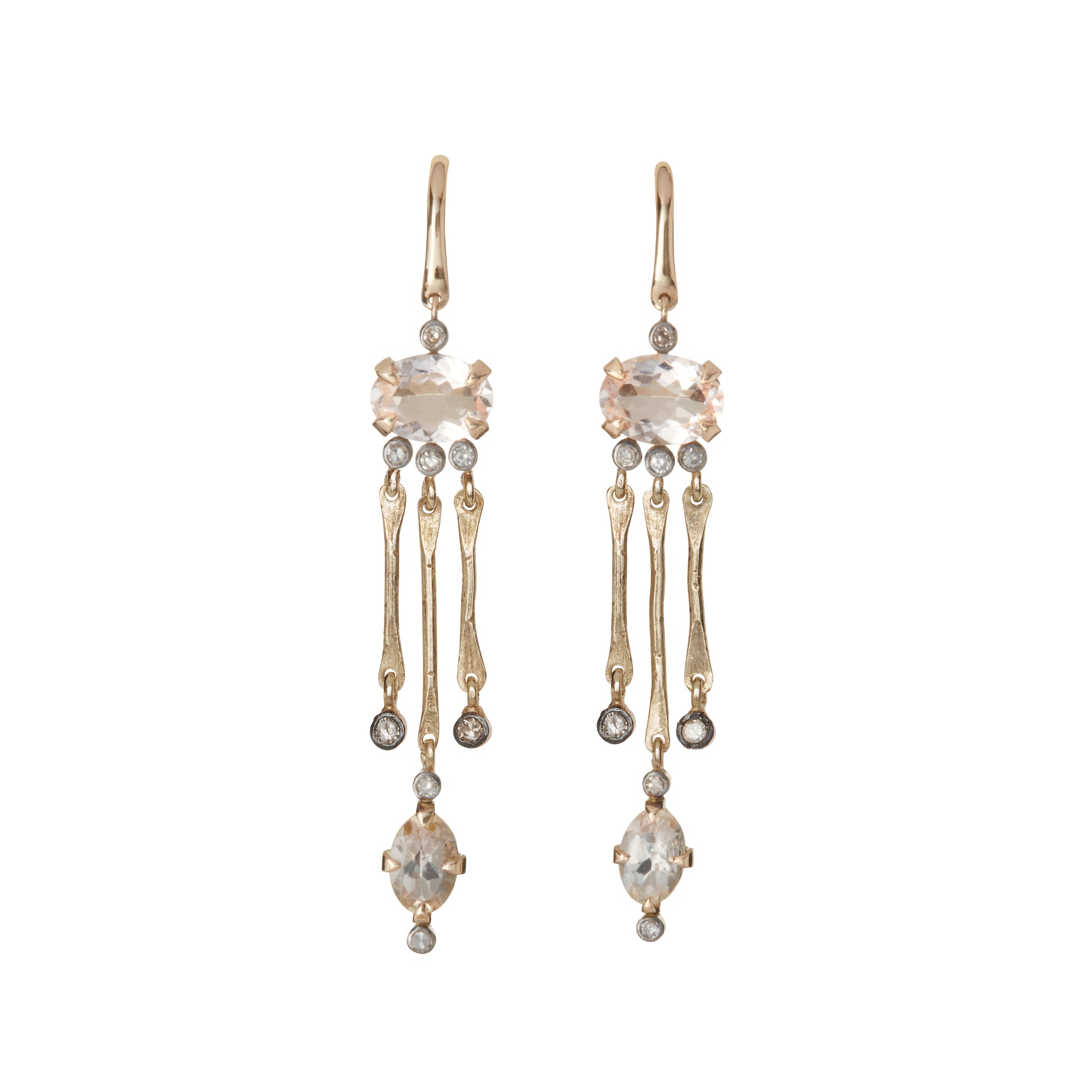 Yellow labradorite, morganite and Diamonds stud these14 karat gold earrings that are uniquely hand-hammered, leaving an impression as memorable as the Milky Way. Dress up your favorite tee and jeans for a girls night out or pair them back to your special event look combined with the Milky Way Necklace. Length 4 cm. Hand made in Paris, France.